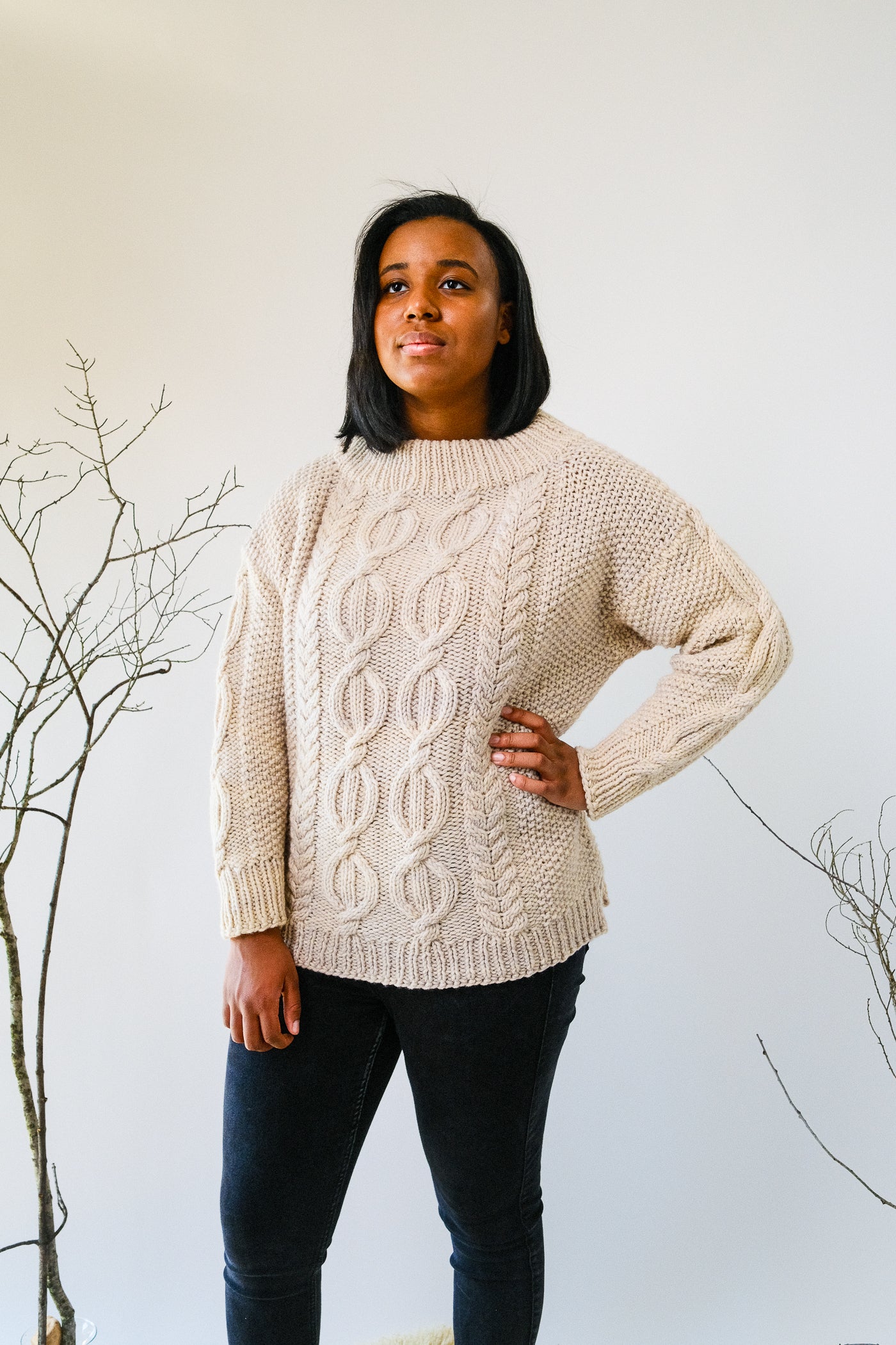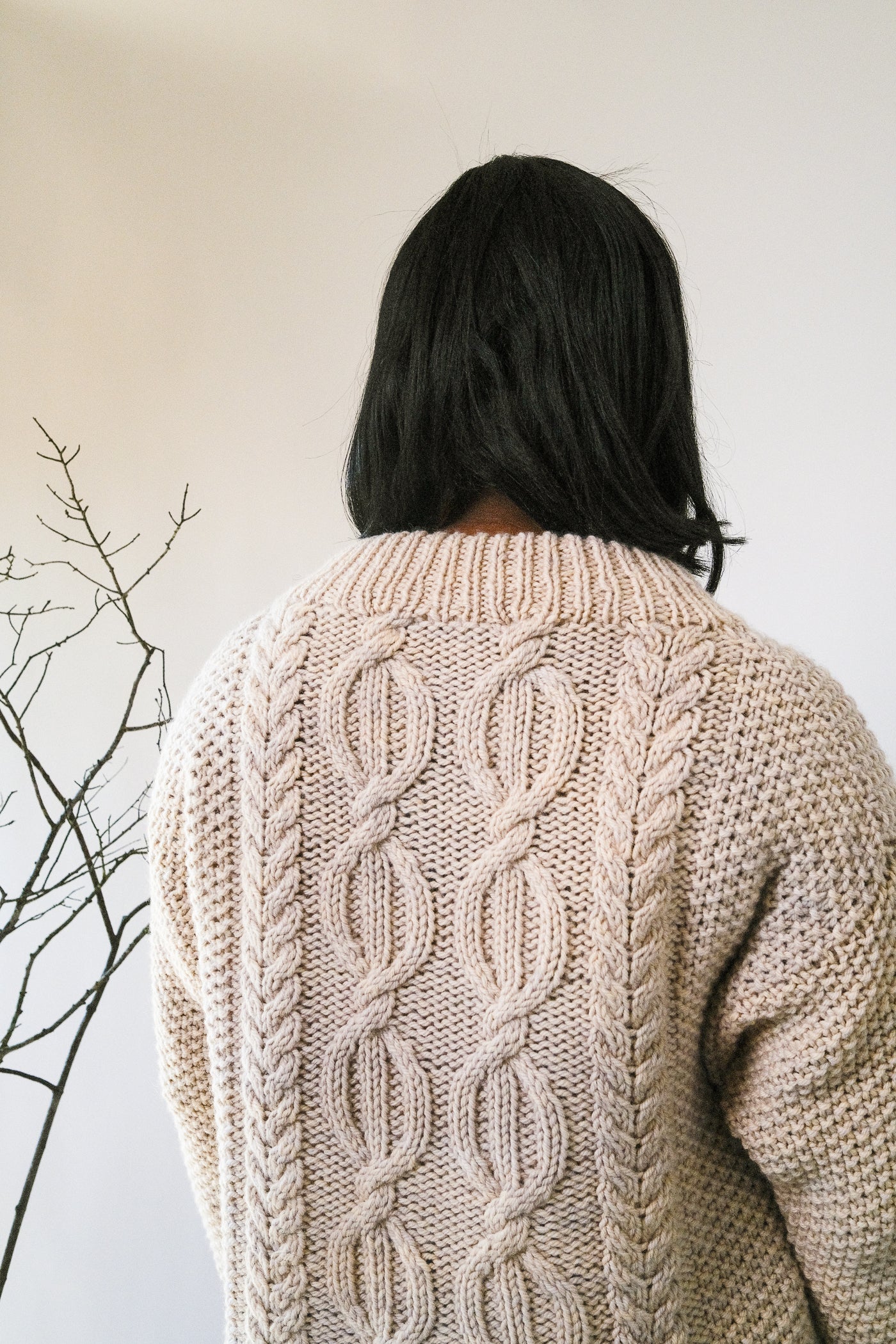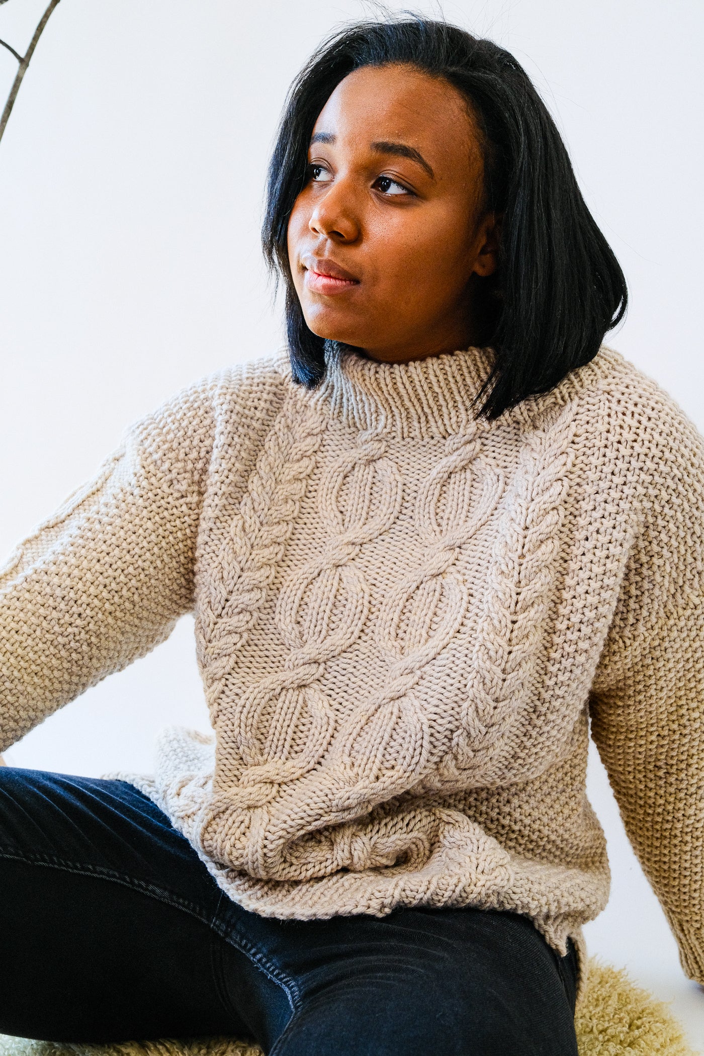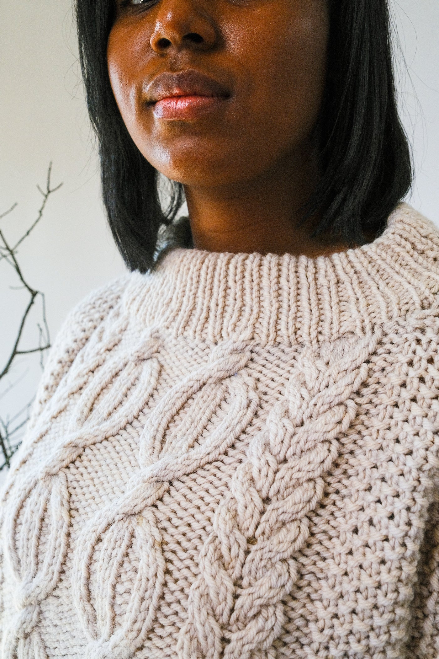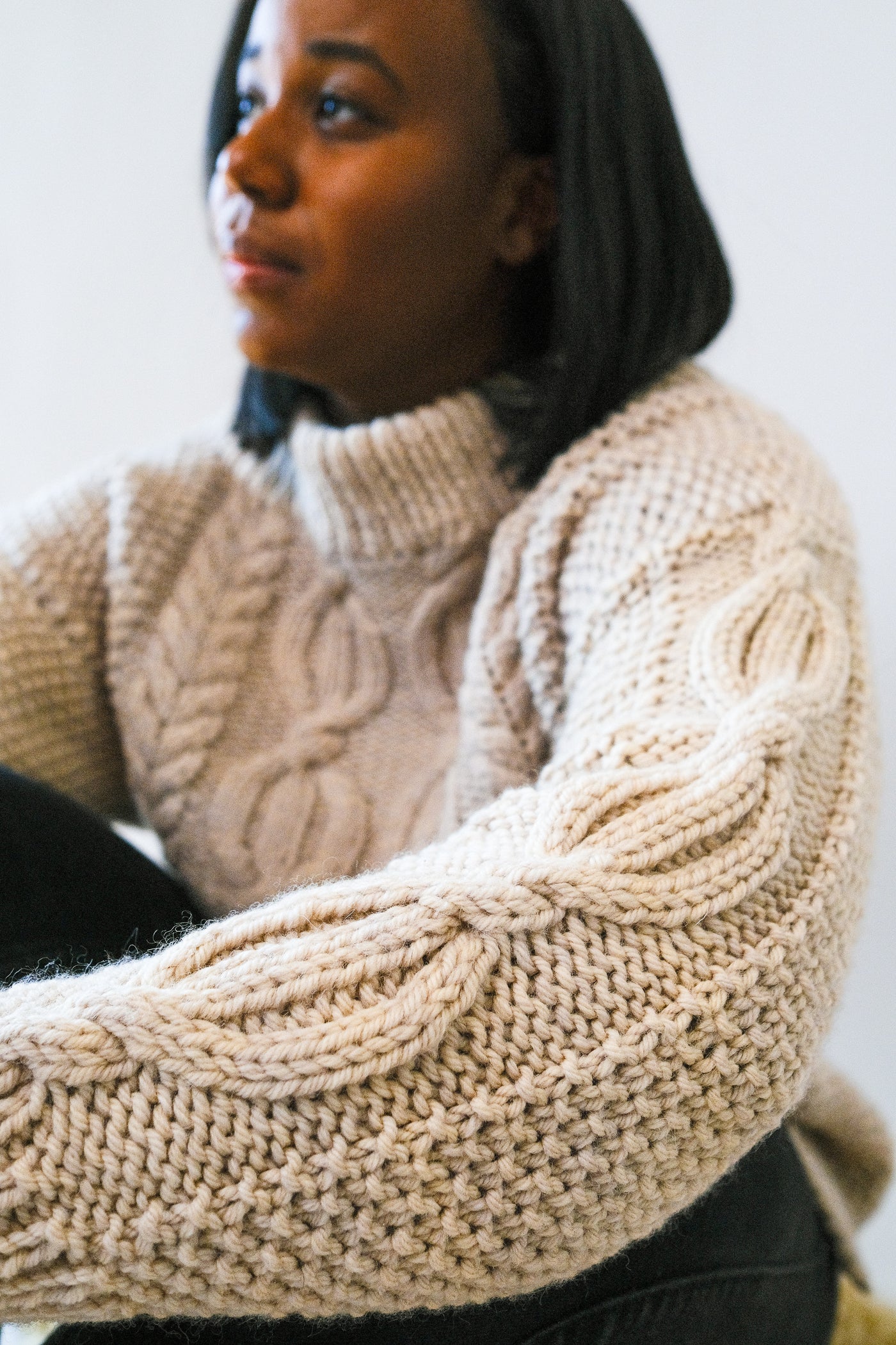 October Mornings is a bulky, drop shoulder sweater. It features a funnel neck and is heavily textured with large cables and seed stitch. October Mornings is one of those cozy, oversized sweaters you can throw on before running out the door and still look polished. The bottom has a split hem knit in 1x1 rib.