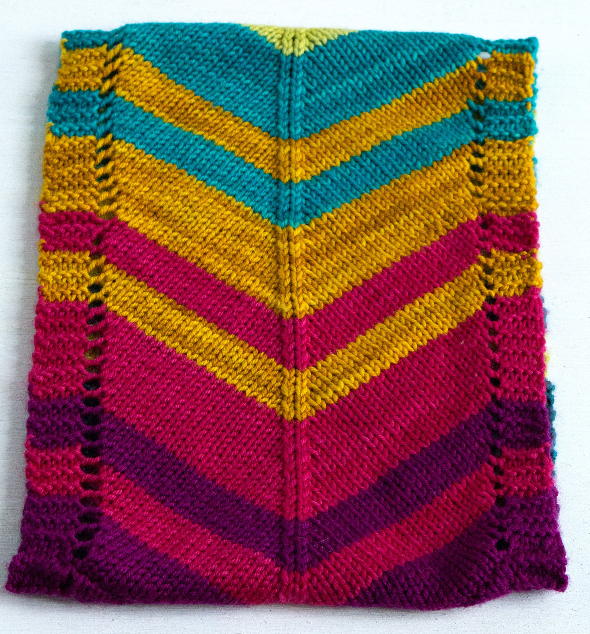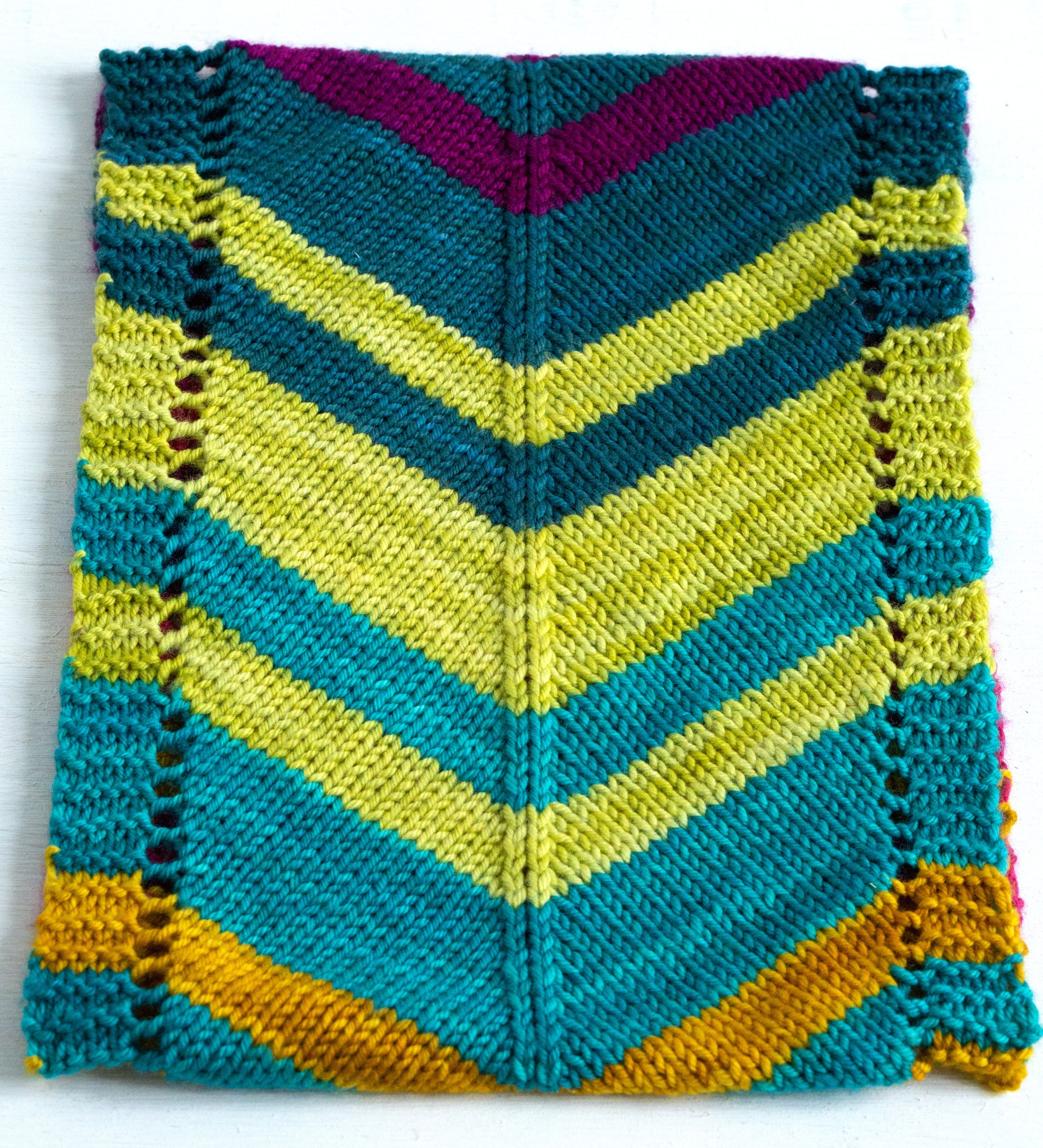 Yarn Requirements: Shown in Alegria Grande Bocados, 1 sk each of AGB2600 Magenta (A), AGB2193 Cactus Flower (B), AGB2058 Turmeric, AGB2363 Tahiti (D), AGB2020 Spirulina (E), and AGB2394 Teal (F).