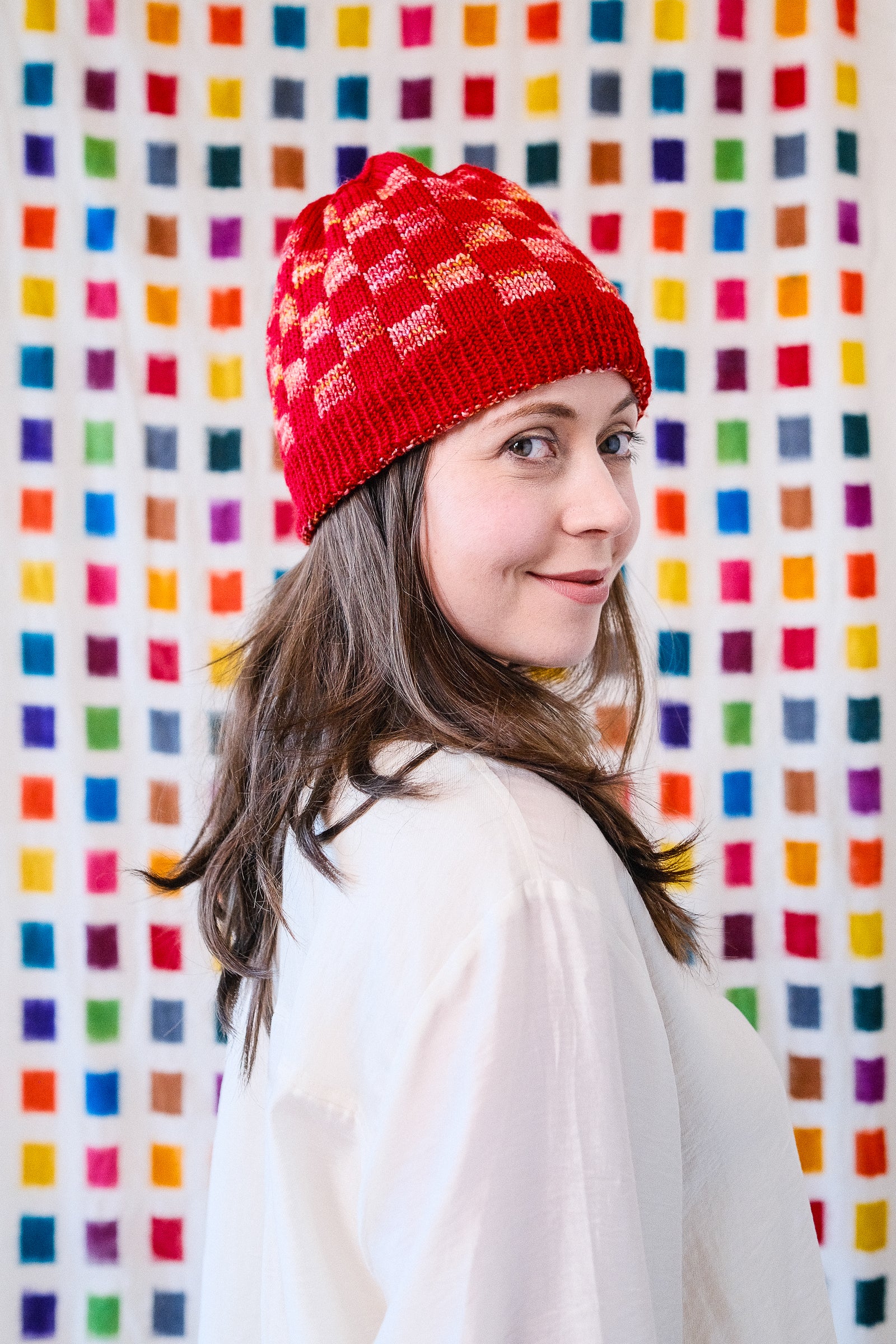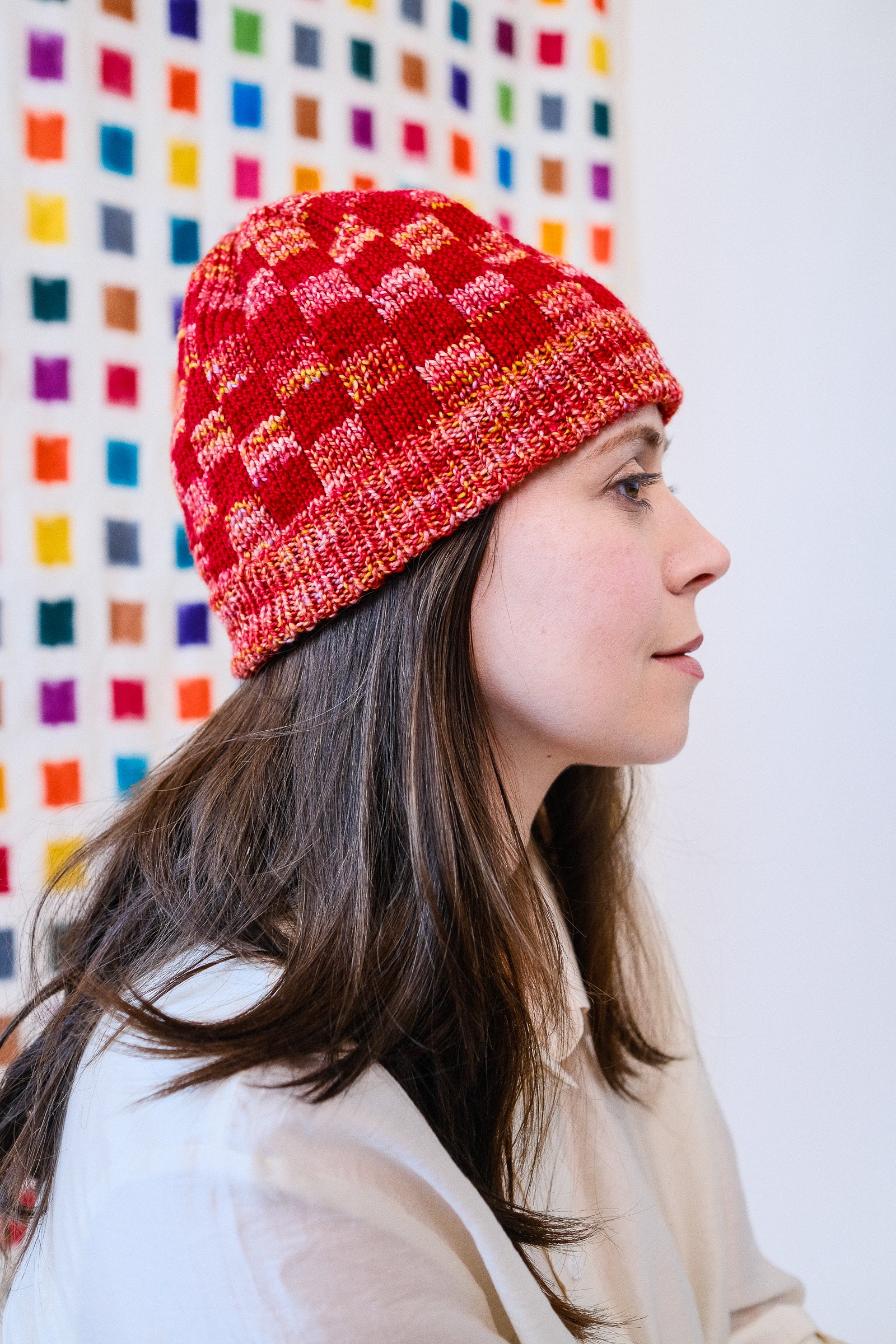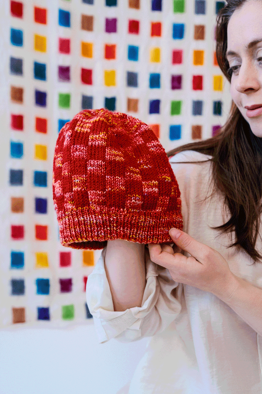 Double knitting: it's twice as warm because it's two hats in one! One one side, Sami dominates; on the other side, Marla. The checkerboard pattern is made easy with the use of plenty of ring markers and ends before the crown shaping. If double knitting is a new technique for you, don't worry: as long as you've made a hat before, this is a good first project.