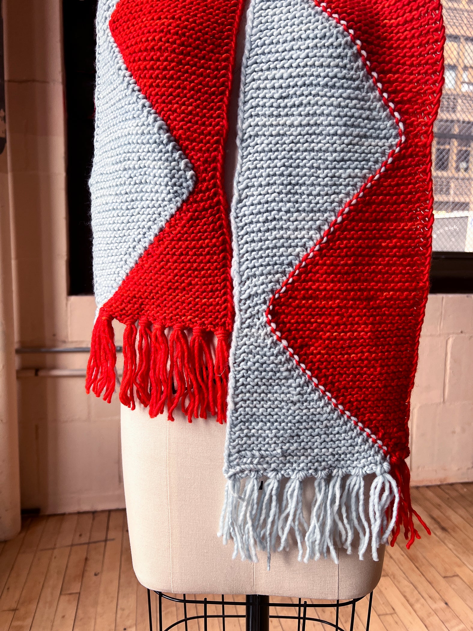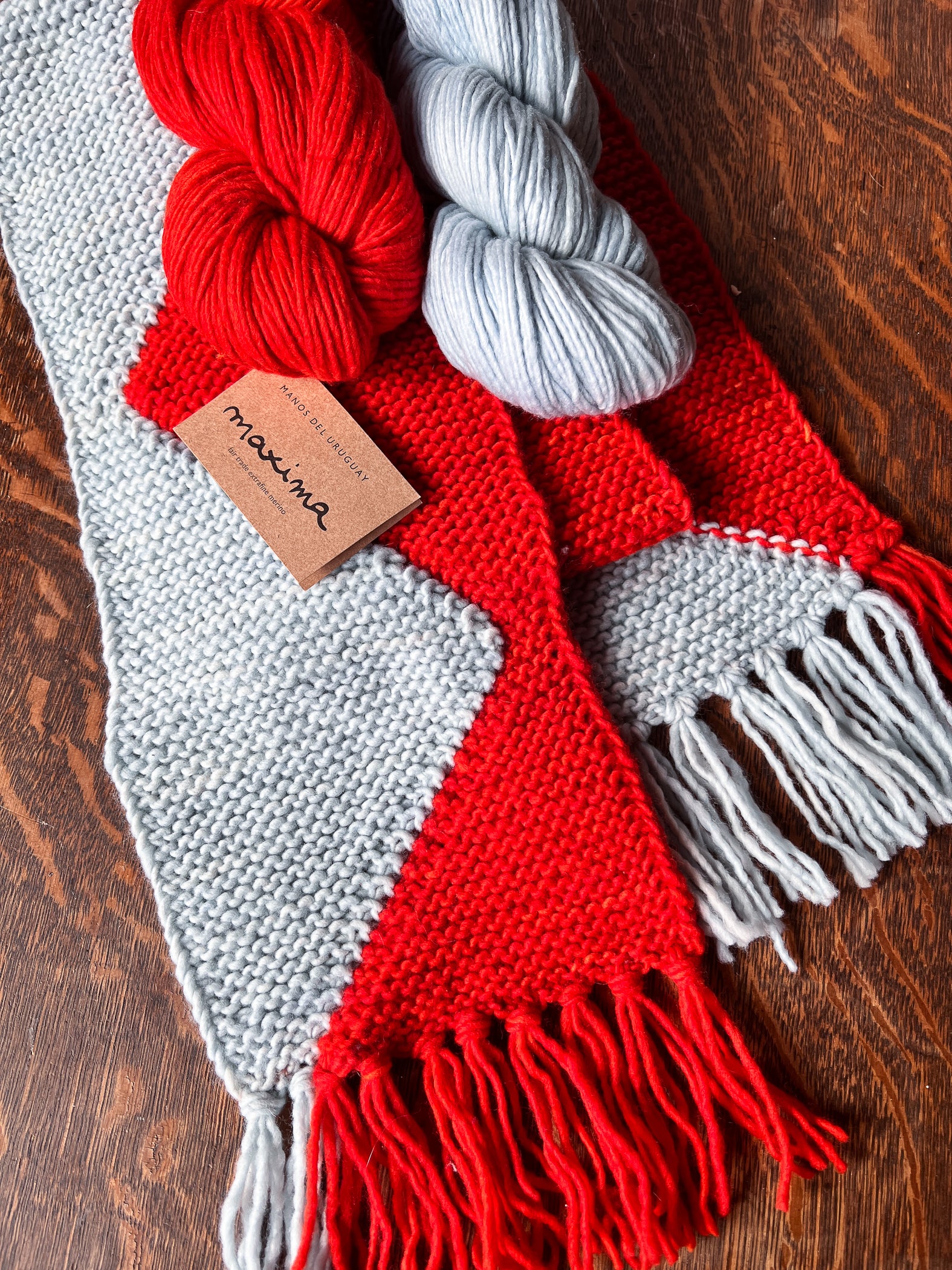 Using just one skein each of two contrasting colors of Maxima, the Sawtooth Scarf is a fun project to dip your toes into intarsia! This free pattern walks you through increasing and decreasing in garter while working in two colors to end up with a vibrant zig-zaggin' scarf! Your leftover yarn is used to make fringe for the ends - notice that this is two color as well.