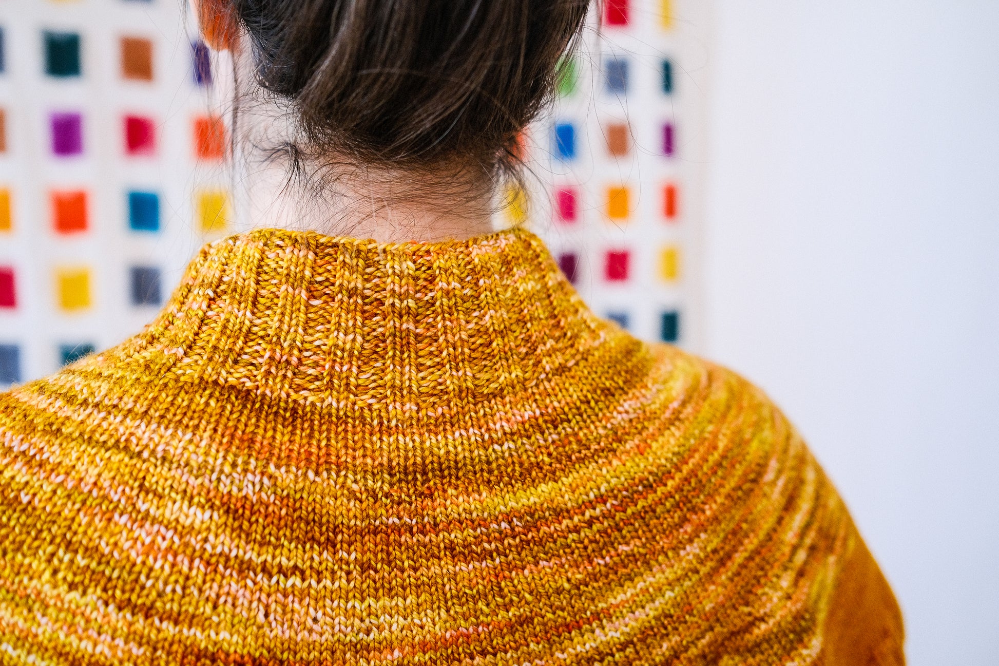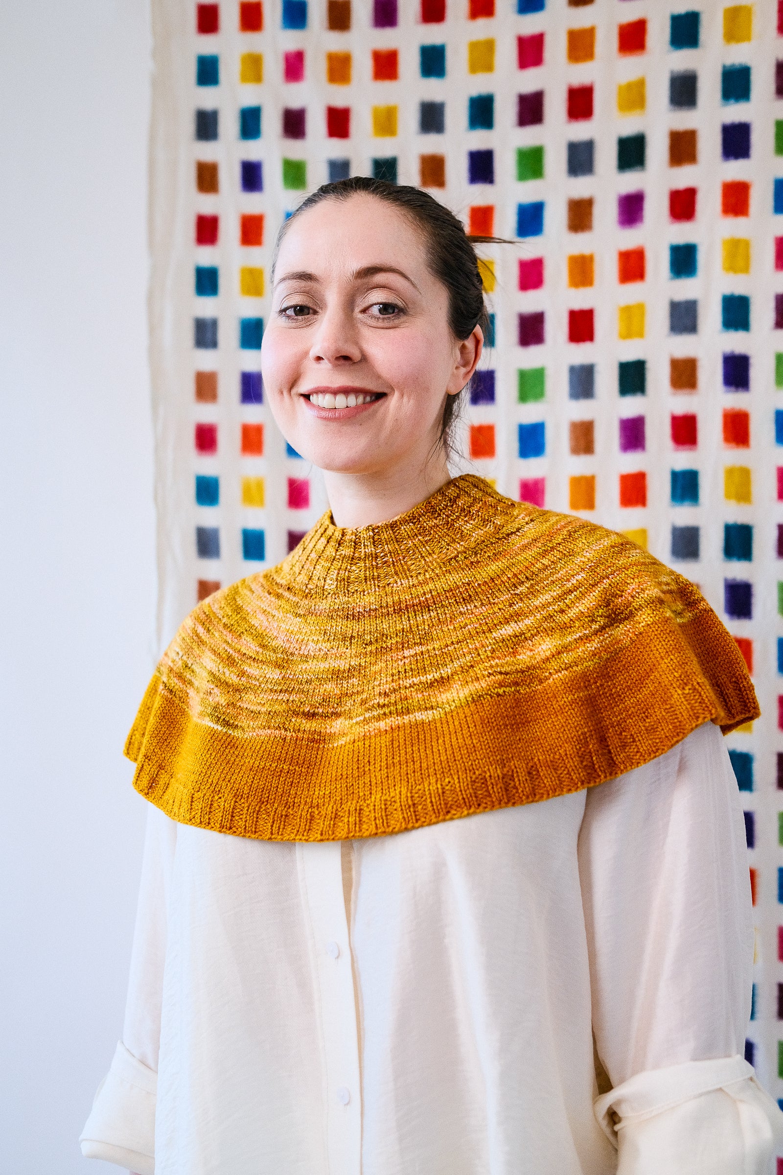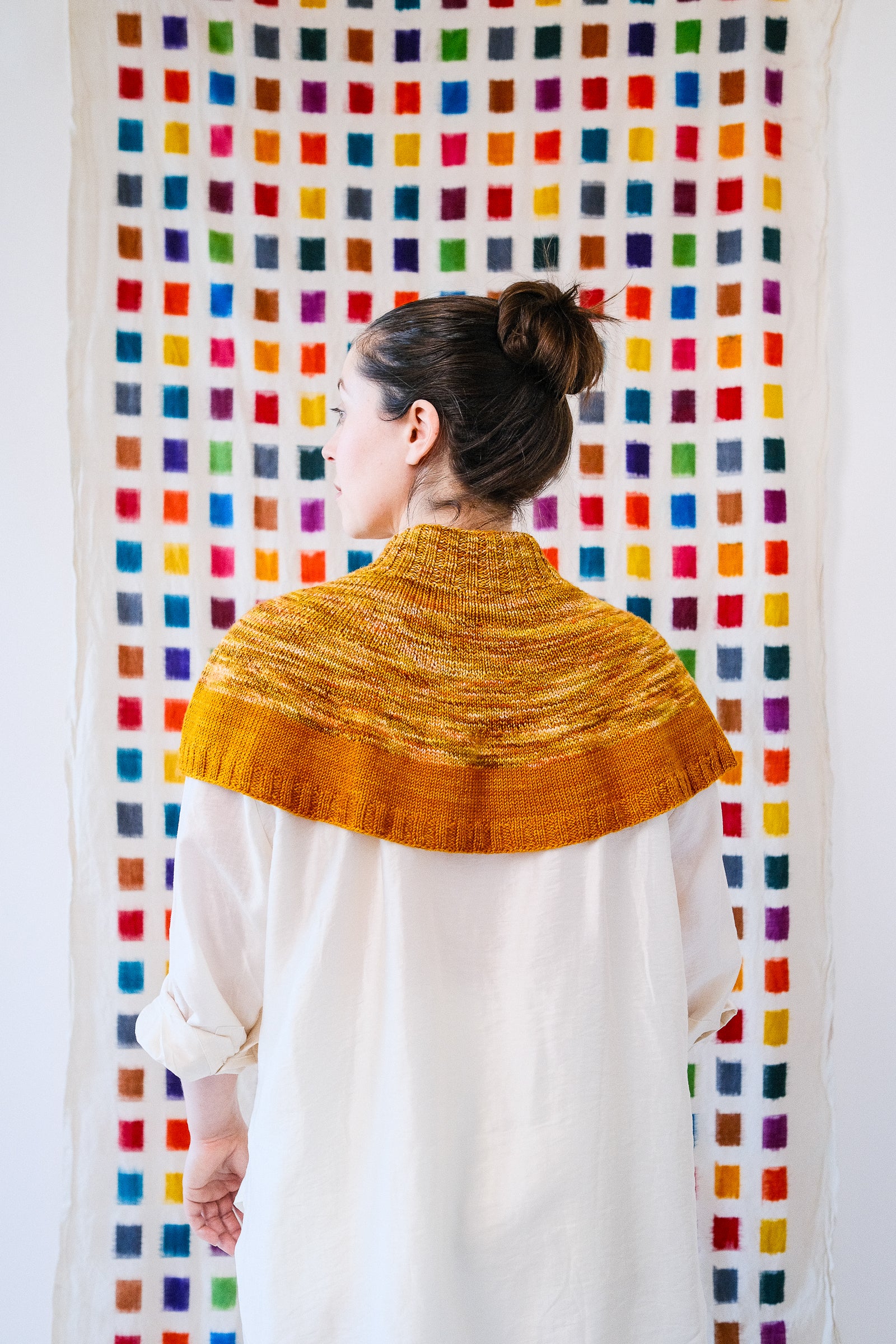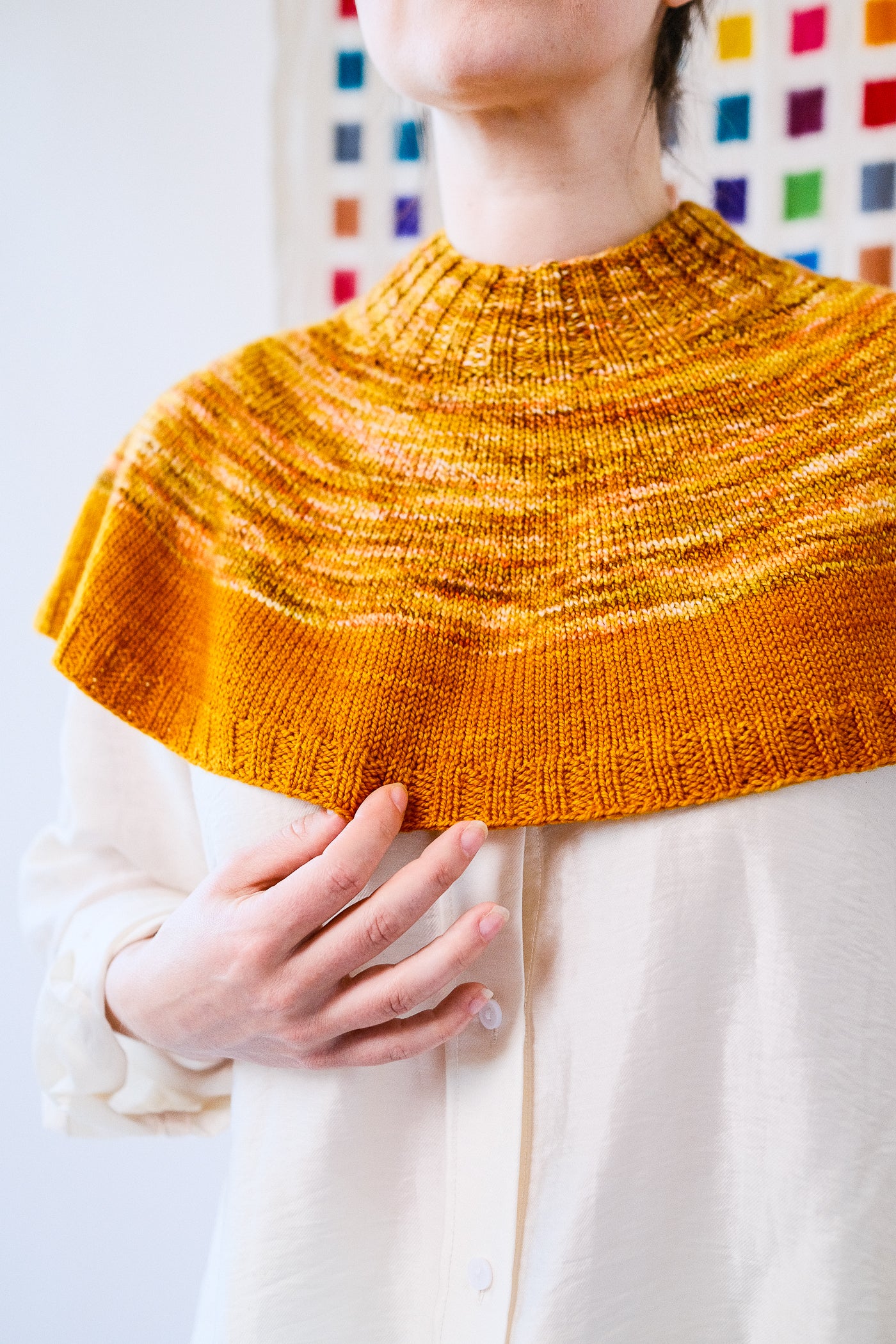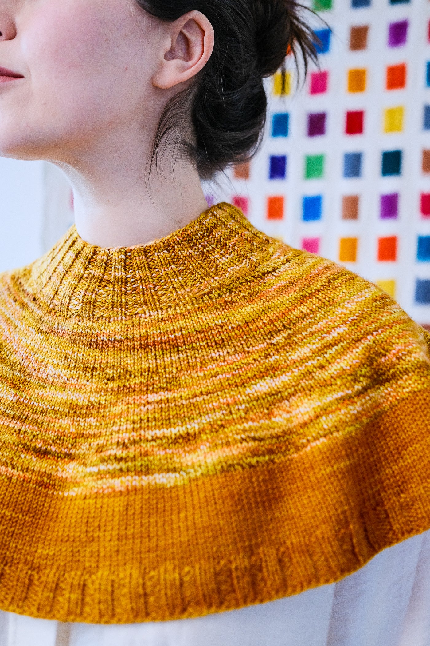 It's a cowl, it's a poncho, it's a capelet -- you decide! This simple yoke is shown here in two coordinating colors of Marla and Sami (one skein of each), but you could decide to make it tweedy all over with Marla alone, or an understated basic in just Sami. Or keep the pairing shown here, but work in stripes wide or narrow. It's easy to imagine knitting several versions of this versatile accessory!