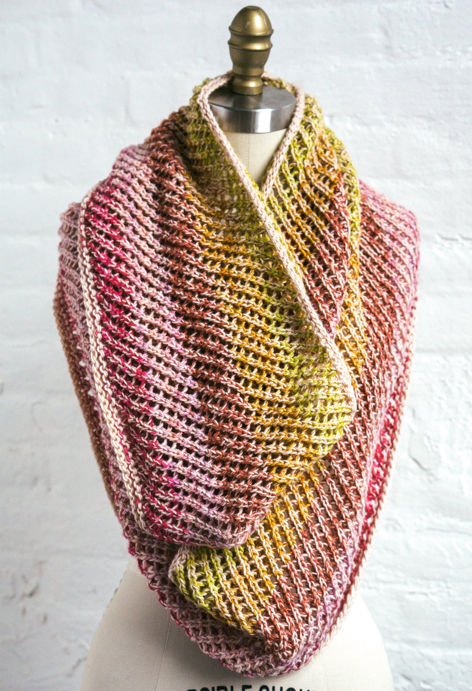 Open and airy mesh cowl holds two strands of Fino together for a marled color effect - shown here in Fino Mini-Skein Kit #16 Sybil + 1 full skein of Fino in 413 Rosewater.