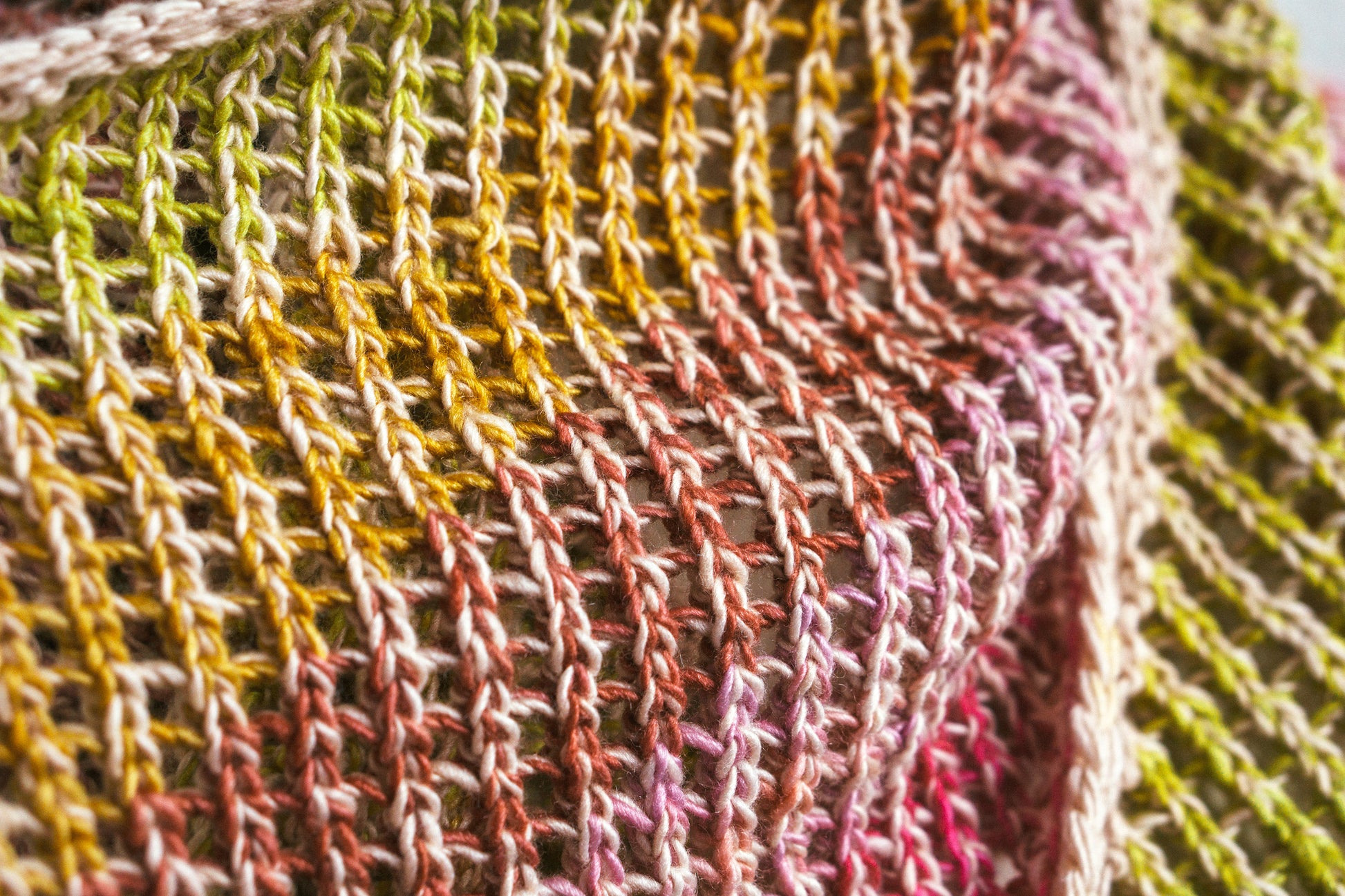 Gauge: 6 repeats across, 10 repeats tall = 4” in Mesh Stitch, blocked