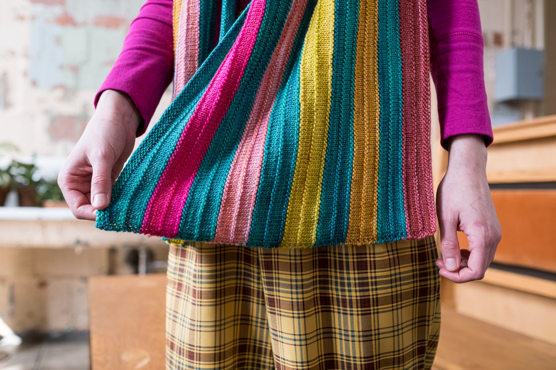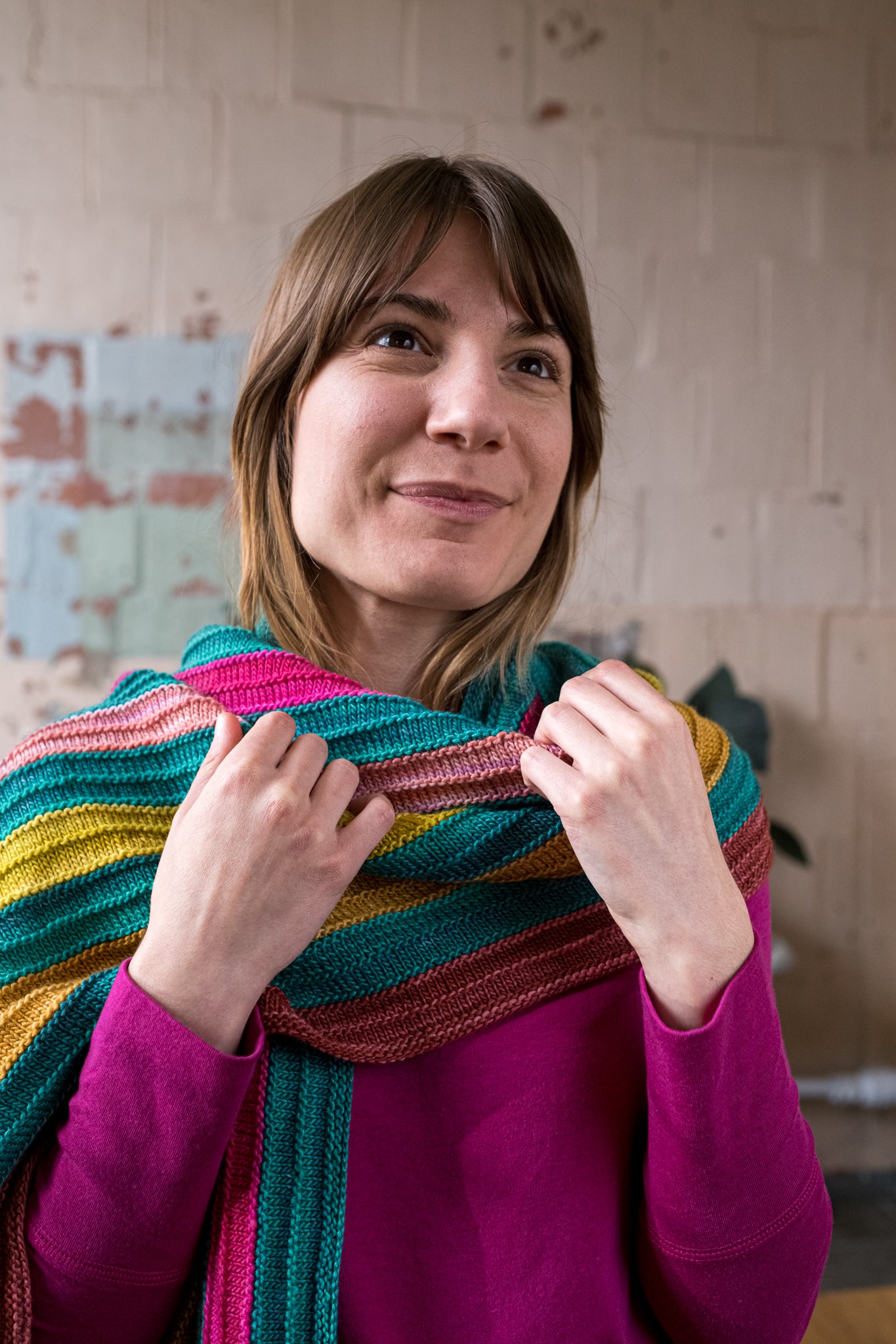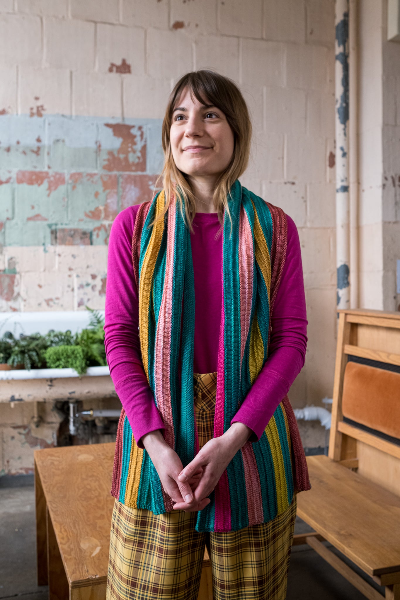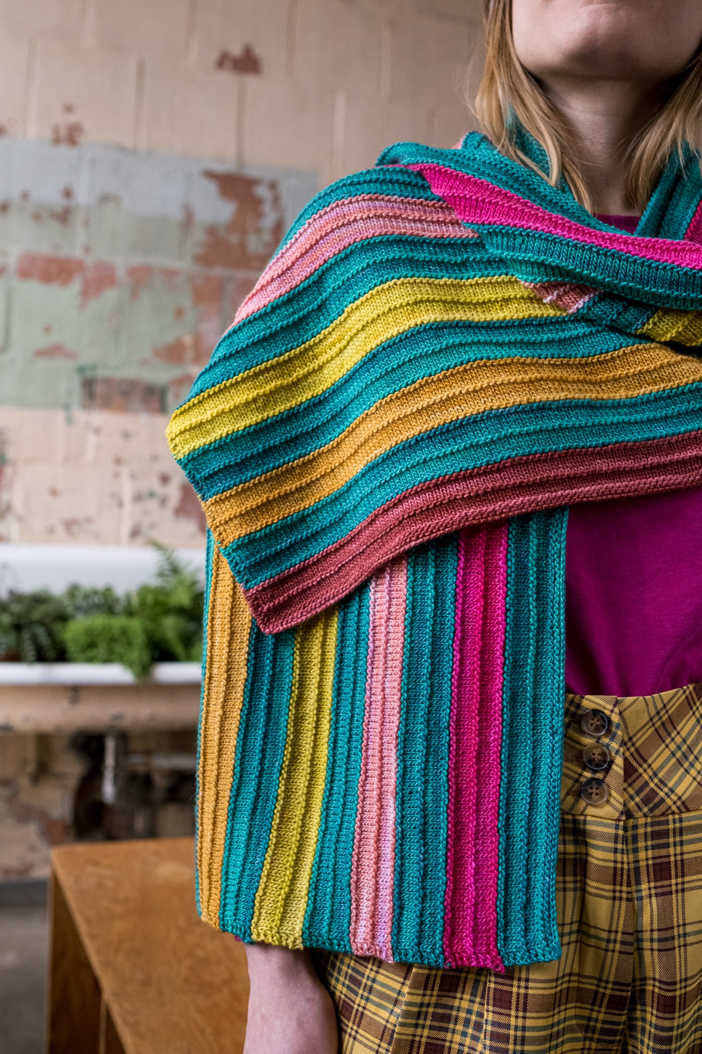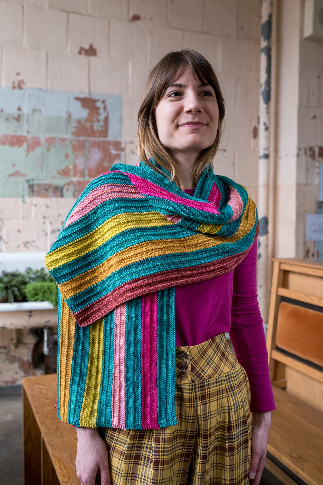 The Sybil Scarf is wide and cozy. A single broad stripe lets each contrast color shine. The structure is predominantly stockinette, with just enough garter to keep the fabric flat.