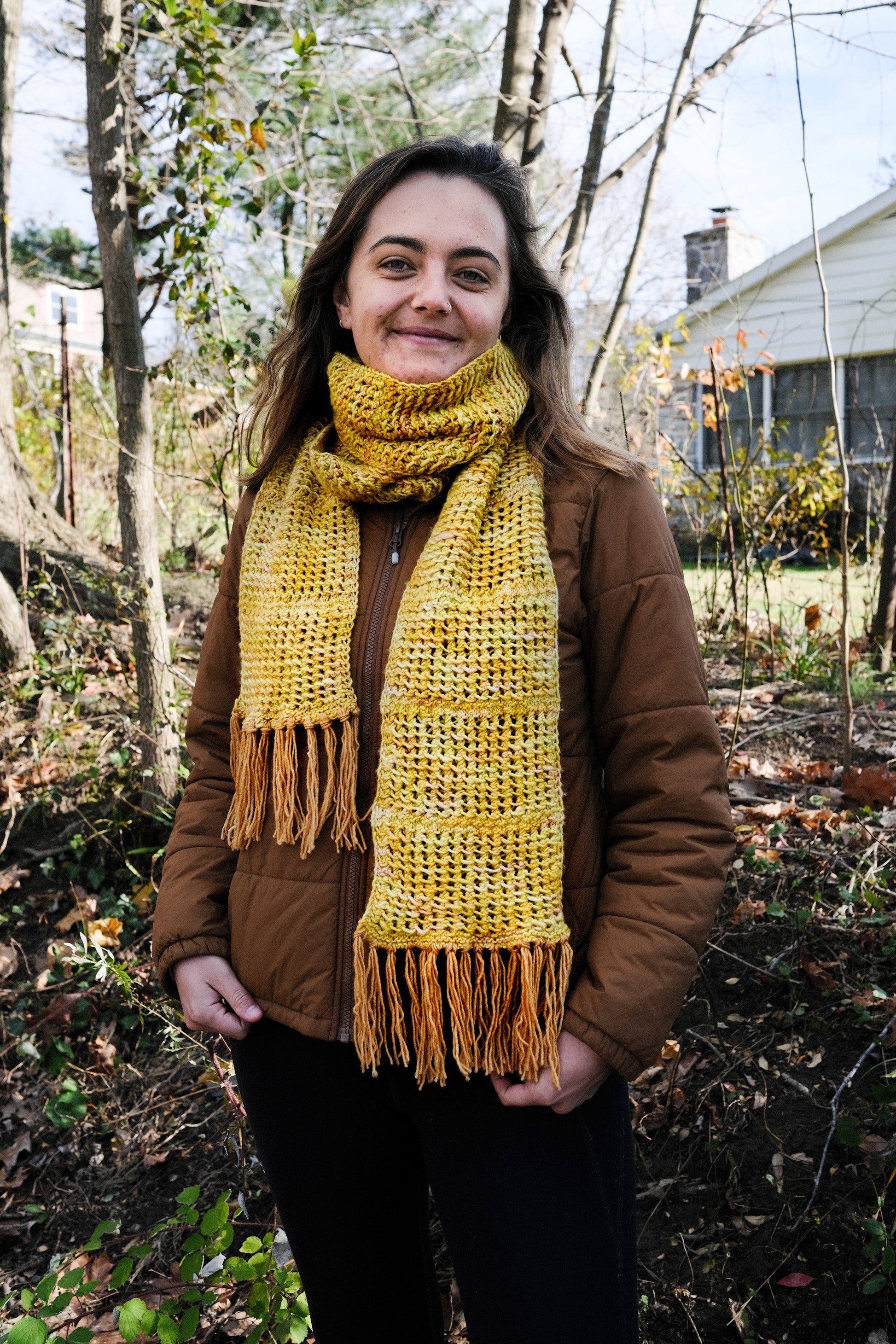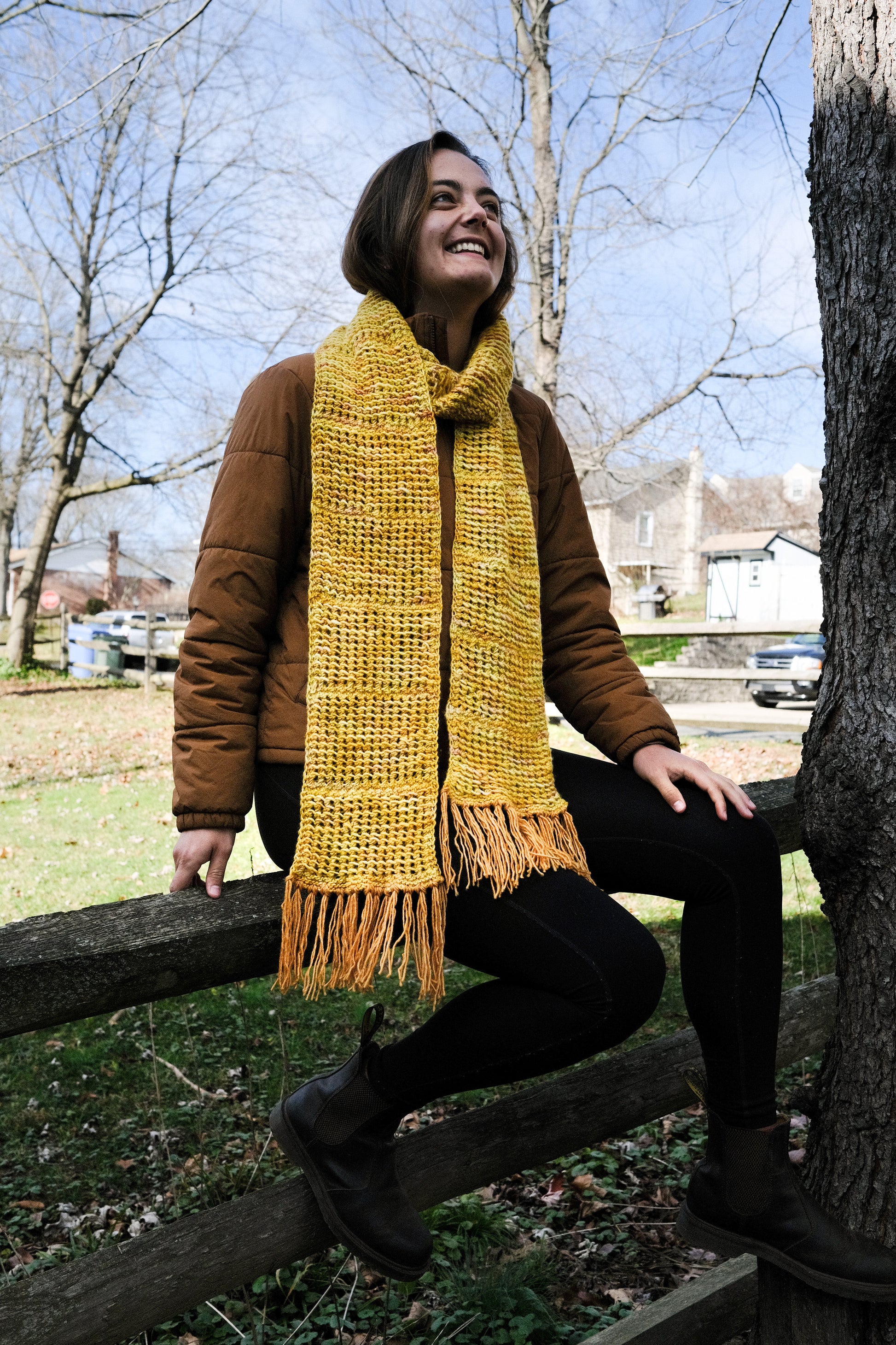 An interesting knit stitch technique gives this scarf a dimensional fabric that one can see through! It's lofty and warm in Silk Blend, a silk-wool single ply yarn, and long enough to do 2 cozy wraps around the neck.